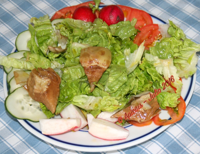 La ensalada de rábanos, pepino, tomate, lechuga y unas alcachofas encurtidas, la he aliñado con vinagre de manzana, sal del Valle Salado de Añana y AOVE, variedad arroniz de Moreda (Álava)