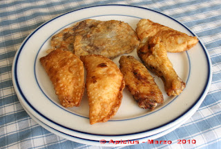 A las pochas le siguen unos fritos a base de unas empanadillas rellenas, así las suelo hacer, muslo/ala de pollo frito, lengua a la romana y medallón de merluza.
